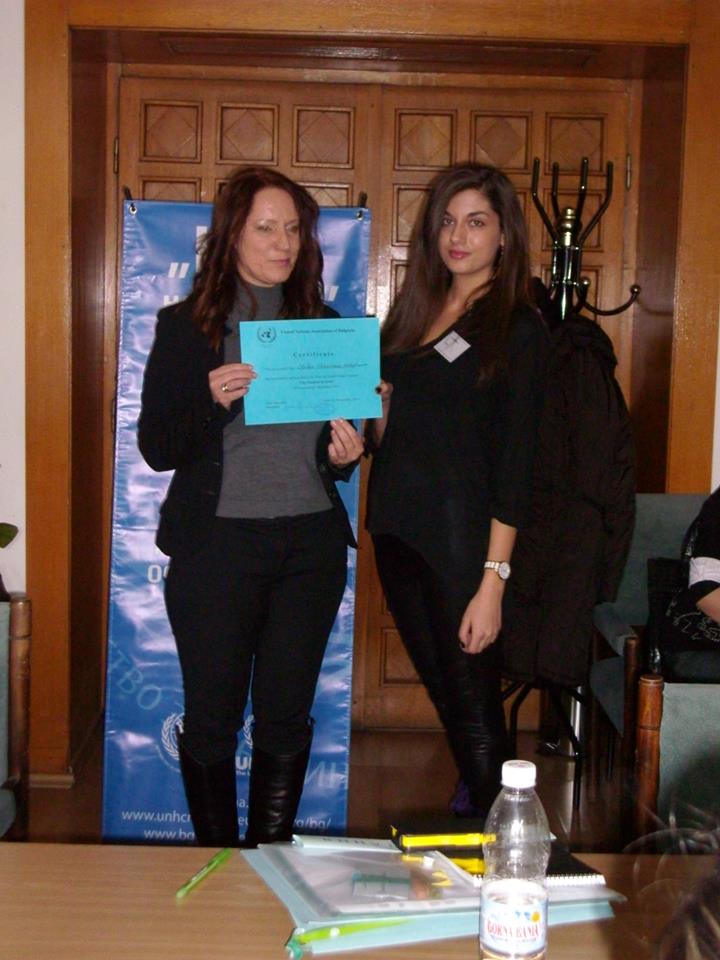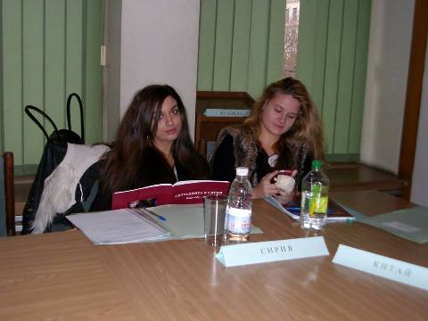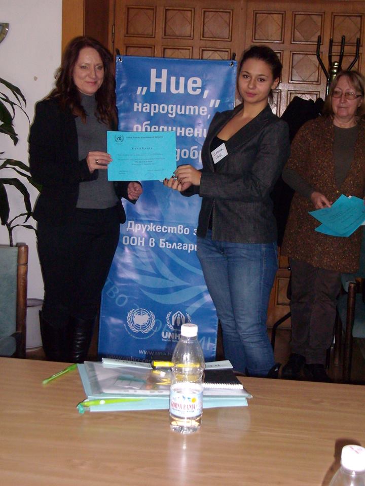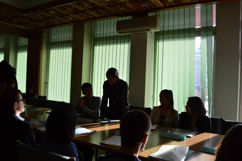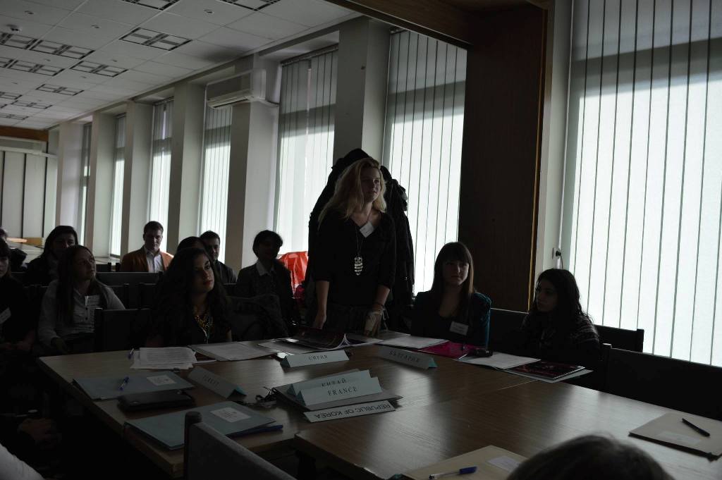 Елена от 11.д, Александра от 11. в, Елена и Стефани от 11.б клас в два отбора представиха позициите на Сирия и САЩ във връзка с конфликта в Сирия. След предварителна подготовка ученици от клубове за ООН от цялата страна обсъдиха положението и възможностите да се помогне на страната изпаднала в криза. Представени бяха страните участващи в Съвета за сигурност. Отборите излязоха с резолюция, в която направиха своите предложения за разрешаване на конфликта.