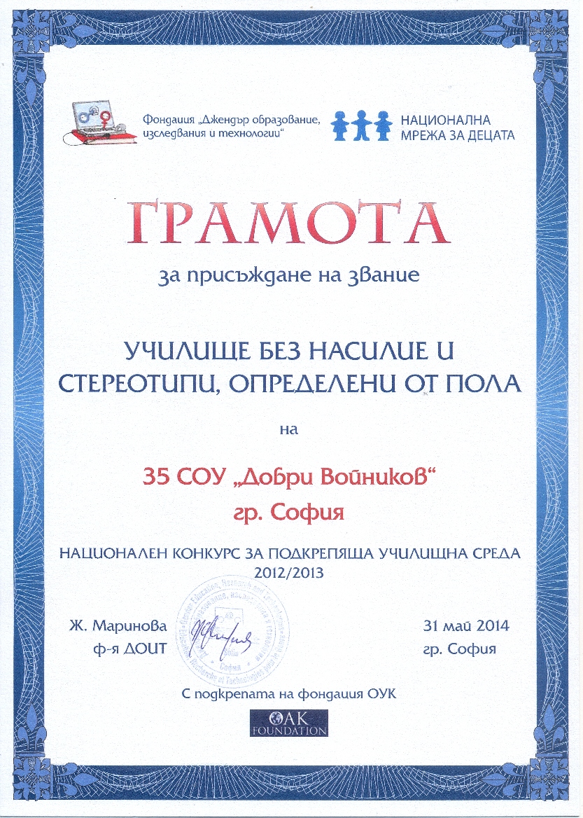 Tази година нашето училище получи грамота за участие в миналогодишния проект на Фондация ДОИТ,  с която му бе присъдено званието