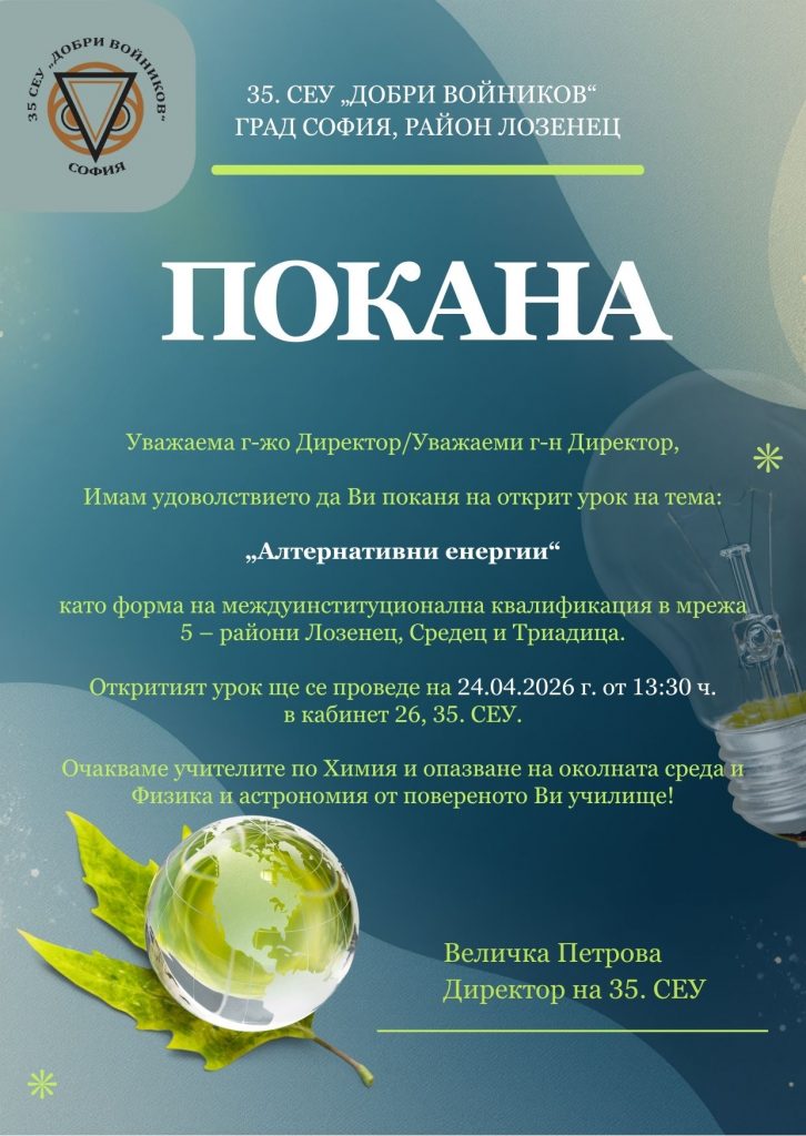 Открит урок на тема „Алтернативни енергии“ с ученици от профилираната подготовка по Химия и опазване на околната среда и Физика и астрономия в XII клас.Заповядайте!